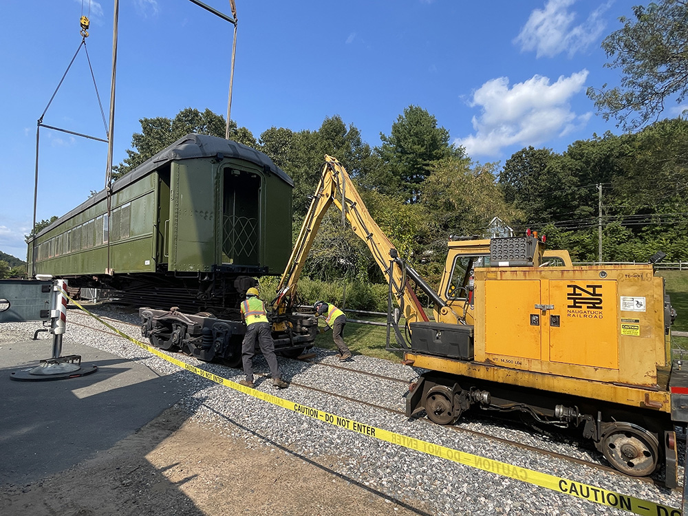The coach required a more circuitous route through New York and Pennsylvania. 4977 crossed into Connecticut on I-84 on Friday, September 13th, and arrived in Waterbury at about 1:30 p.m. Using two cranes provided by Summit Crane of Plainville, the car was lifted and reassembled, back on the rails, by 3:45 p.m.