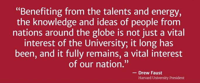 President Drew Faust's message to the community on January 29 referred to Harvard's global nature as one of its strengths, "drawing people together from across the nation and around the world." She also sought to reassure Muslims in the Harvard community, saying "We must not and will not conflate people of a venerable faith with people predisposed to acts of terrorism and violence," and announced Harvard's first Muslim chaplain. She further pointed out that almost "half of the deans of Harvard's schools are immigrants-from India, China, Northern Ireland, Jamaica, and Iran."