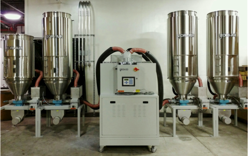 4 hoppers. System expandable for more drying hoppers and molding machines in the future.