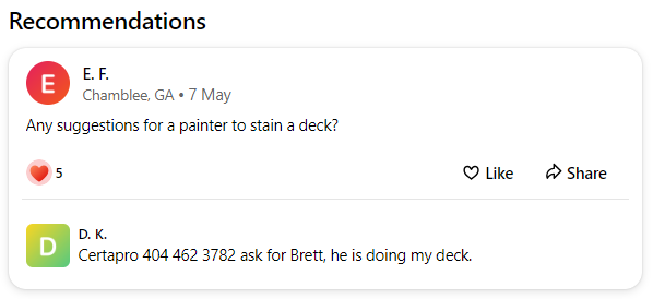 Share your recommendation on Nextdoor and let your neighbors discover the magic of transforming homes with CertaPro Painters® of Dunwoody. | | |