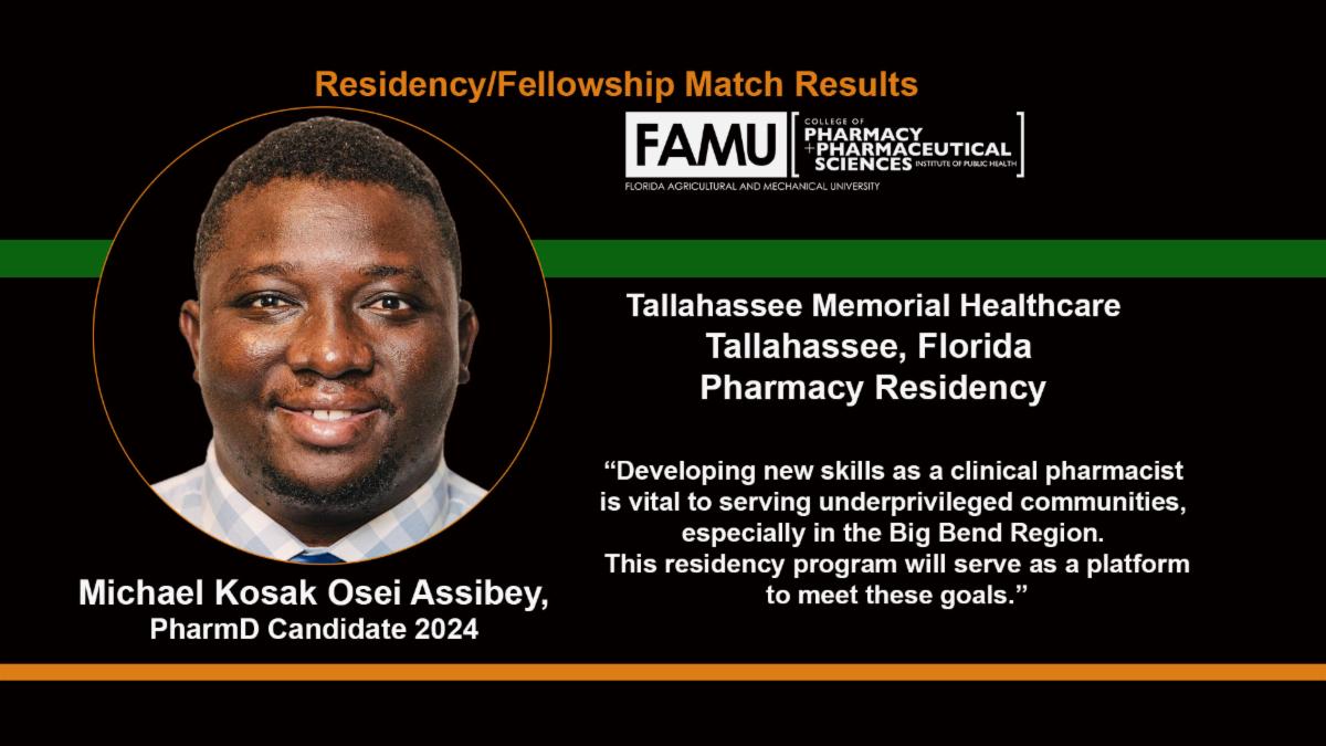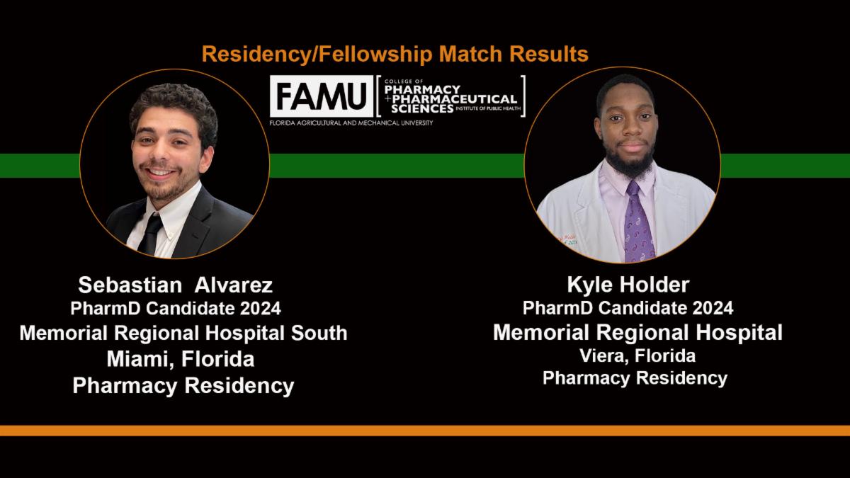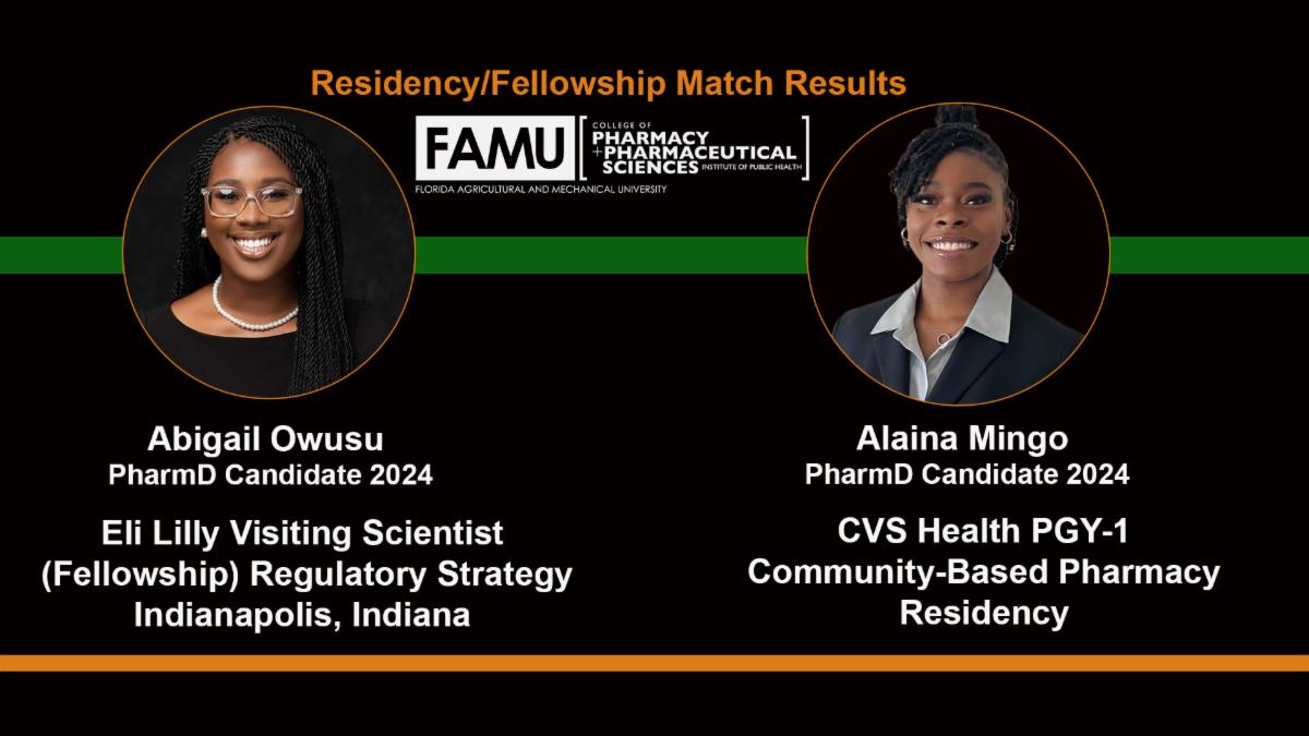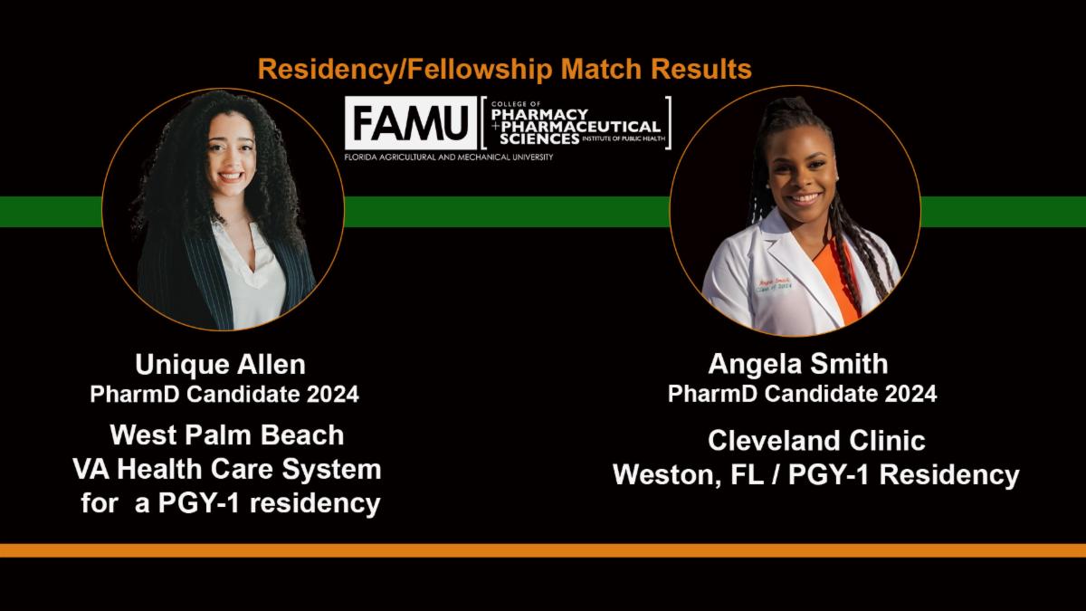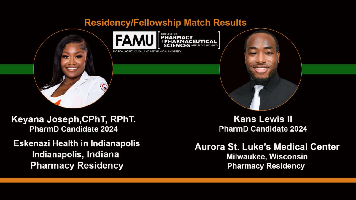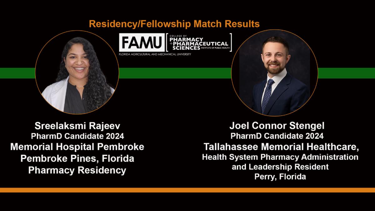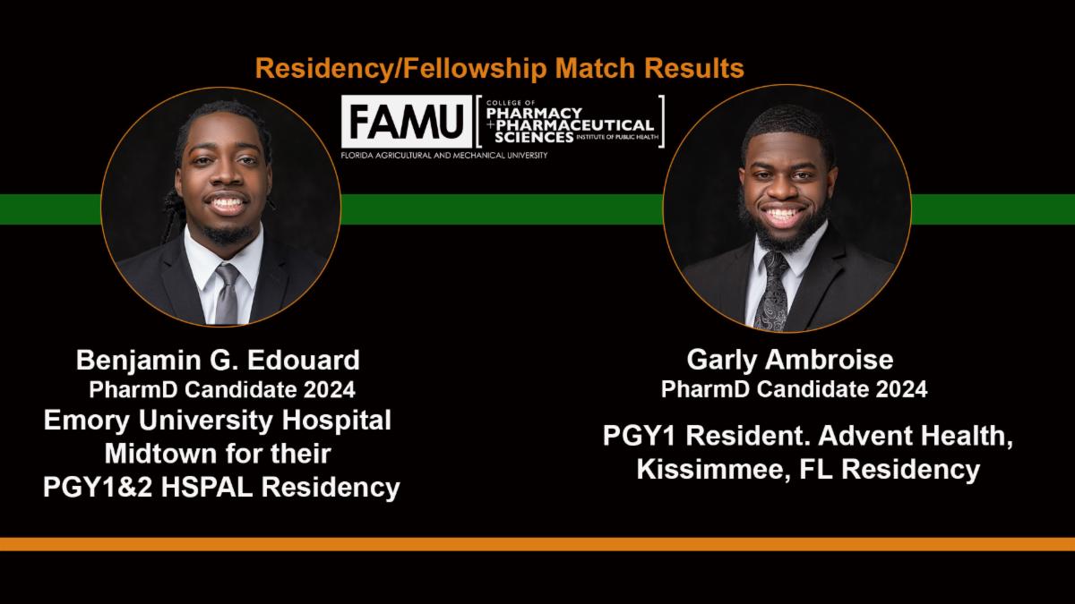 The remaining FAMU CoPPS, IPH-ASHP matches and their placements are: Briana Bethune (Kaiser Foundation Health Plan of Georgia, Inc. Atlanta, GA); Amanda LeAnn Collier (Memorial Regional Hospital, Hollywood, FL); Ebony Crawford (Wellstar MCG Health Medical Center, Augusta, GA); Kira Gaddis (University of Mississippi School of Pharmacy, Oxford, MS ); LaKayla Deneshia McDonald (CVS Health - North Houston, TX); Agnes Musyoka (Ascension St. Vincent Riverside, Jacksonville, FL); Rhoda Musyoka (AdventHealth Sebring, FL); Munachimso Blessing Okoli (Tallahassee, FL Memorial Healthcare); Starr Renesca (HCA Florida Largo Hospital); Jaylan William Lewils Telusca (Tallahassee, FL Memorial Healthcare); Rayna Danielle Wallace (Family Health Centers of Southwest Florida, Port Charlotte, FL); Chidinma Sandra Ogbenna (Memorial Regional Hospital, Hollywood, FL); Simon Anthony Amofah (CVS Health, Miami, FL); Feglynn Louis Jean-Baptiste (Cleveland Clinic Tradition Hospital, Port Saint Lucie, FL); and Diamond Williams (Greensboro, NC). |