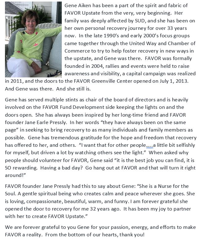 For those of you who support the work of FAVOR Upstate with your time, talent and treasure, we sincerely thank you. We never take your generosity for granted and we want you to remember you are a significant part of our daily services – even if you don’t know it. If you don’t already and you’d like to support the work we do, we have a secure online giving portal or you can call us directly at 864-430-0586.