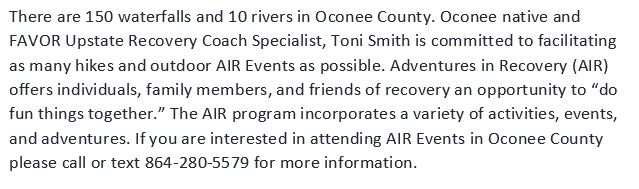 FAVOR Upstate exists “to provide everyone in the Upstate of SC a fighting chance at recovery.” One of the ways we do this is by partnering with local community service agencies. If you follow us on social media (Facebook, Twitter, Instagram) you’ll read a monthly “Partner Highlight,” and on our website we have an extensive list of partner/referral agencies representing service providers at the local, state and federal levels. If you don’t see what you’re looking for, call us and we will help.