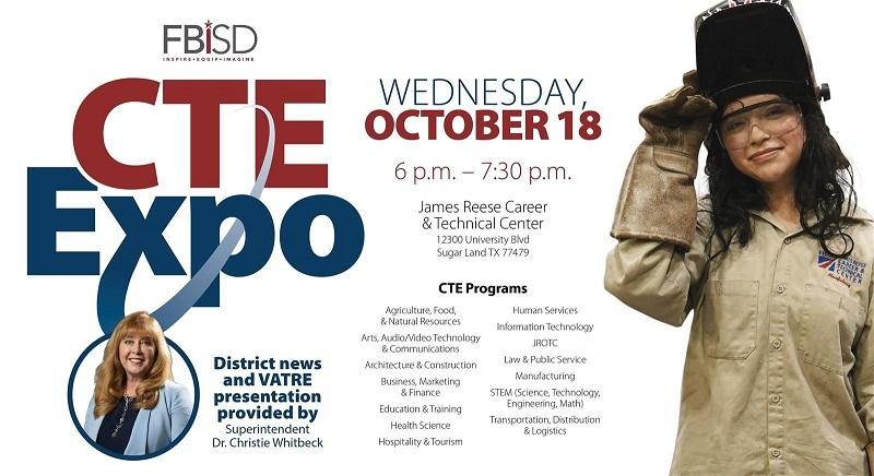 Fort Bend ISD will hold an expo to showcase its Career and Technical Education programs housed at the James Reese Career and Technical Center (12300 University Blvd., Sugar Land, TX 77479) on Wednesday, October 18, at 6 p.m.