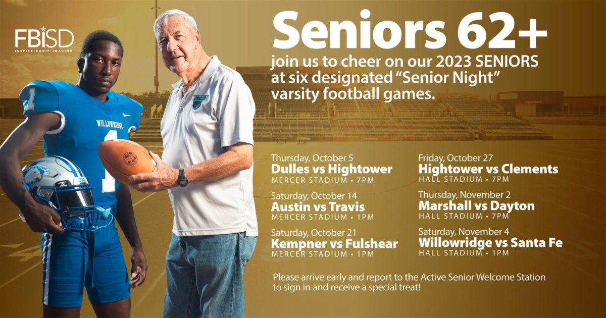 Just for our Active Seniors! Join us to cheer on our class of 2023 seniors at six designated "Senior Night" varsity football games. Arrive early and check in at the Active Senior Welcome Station, located at the northwest entrance, to sign in and receive a special treat.