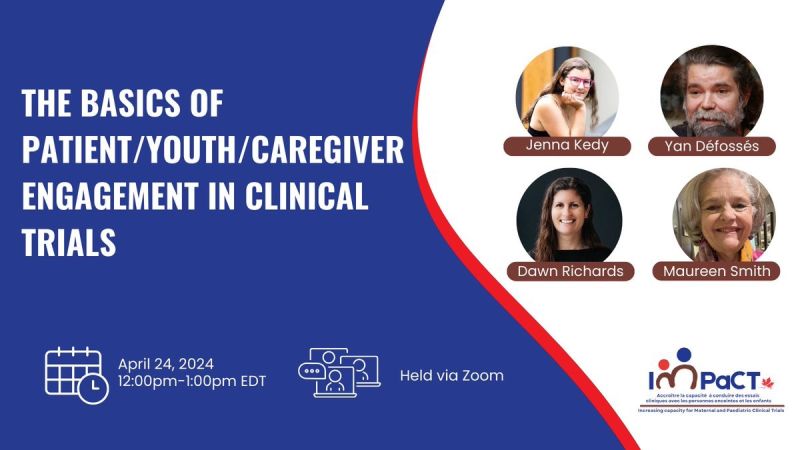 Join us for our first IMPaCT webinar focused on youth and family engagement in pediatric and perinatal trials. Hear from IMPaCT parent partner Yan (FER graduate and instructor) and youth partner Jenna and from patient engagement specialists Maureen and Dawn! | |