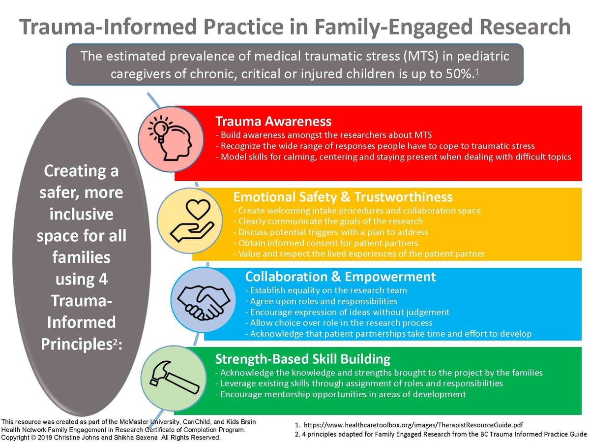 This infographic has been prepared for health researchers involved in family engaged research. It presents a rationale for utilizing trauma-informed practice in order to create a safer, more inclusive space for families to participate in health research and presents principles and strategies to assist researchers in this process.