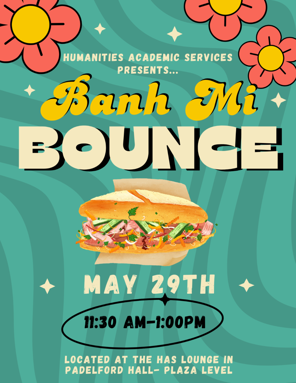 Don't forget to join HAS in our cozy lounge to enjoy some free food, music, and good vibes for our Bahn Mi Bounce!