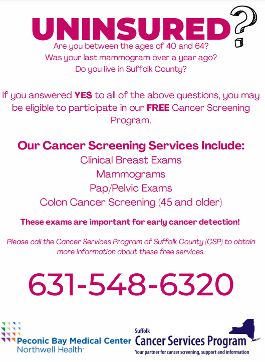 Walk-ins are welcome for those with insurance. For those that are under- or uninsured, please call (631)-376-3051 to schedule an appointment for a free breast screening. For screening mammograms only, to be eligible women must: be y 40 years of age or older, have not had a mammogram within the past 12 months. No insurance necessary. Food and refreshments will be available.