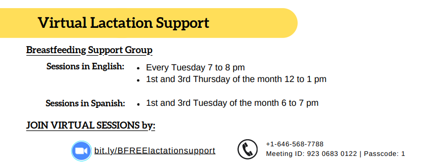 FREE breastfeeding/chest feeding support groups for expecting an new parents (and their families)! Sessions are available virtually or in person, and in English, or Spanish. Sessions entirely in Spanish are led by bilingual and bicultural lactation professionals. Please direct any questions to BFREE@northwell.edu