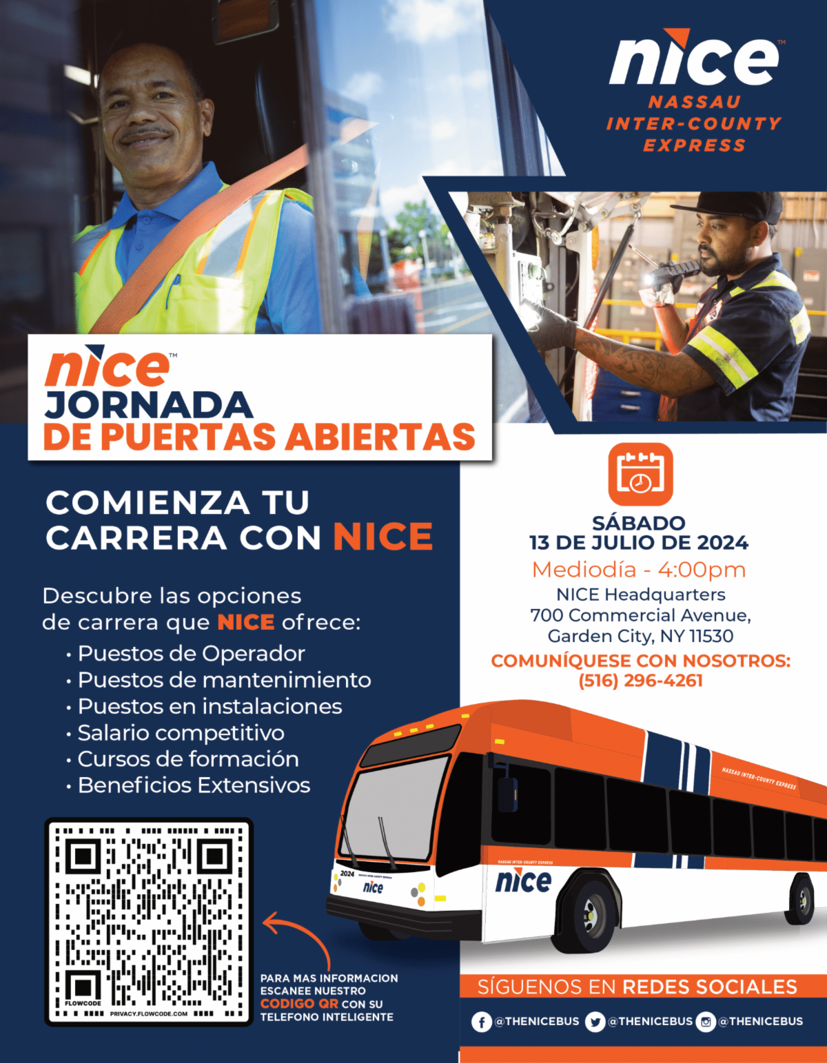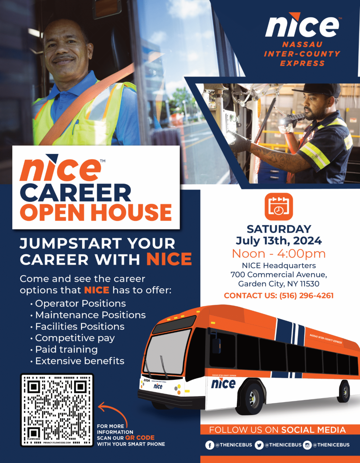 NICE is one of the largest employers in Nassau County and offers competitive pay, paid training, and extensive benefits. Their Career Open House will take place at our Headquarters in Garden City, at 700 Commercial Avenue on Saturday, July 13th from noon to 4:00 pm. NICE BUS is not just a workplace, it is a community. That's why they've planned activities for the kids too! We want everyone to feel welcome and included in this event.