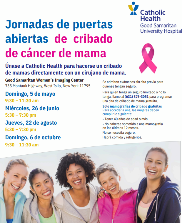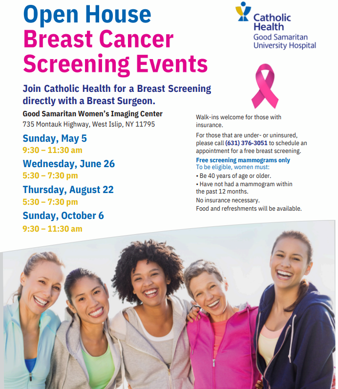 Catholic Health is hosting multiple breast cancer screening events in August and October. The screening events will be hosted at Good Samaritan Women's Imaging Center at 735 Montauk Highway, West Islip, NY 11795 on the dates and times listed below.