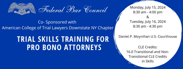 As part of the Federal Bar Council’s Access to Counsel Project, and in partnership with the ACTL Downstate New York Chapter, the Federal Bar Council is pleased to offer an intensive Trial Skills Training program for attorneys who represent or agree to represent civil pro se litigants in the SDNY and EDNY. This training will be held on Monday July 15th and Tuesday July 16th, from 8:30AM-4:00PM at the Daniel P Moynihan U.S. Courthouse.