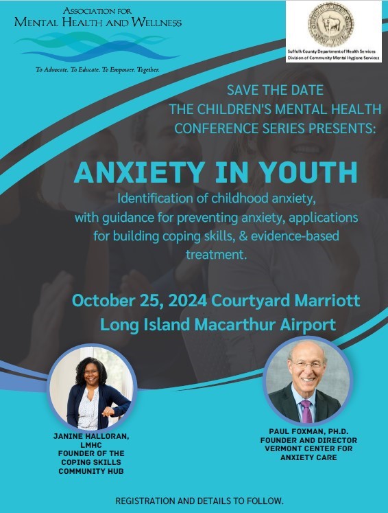 Save the date for The Children's Mental Health Conference Series: Anxiety in Youth Conference on October 25th, 2024 at the Courtyard Marriott at Long Island Macarthur Airport.