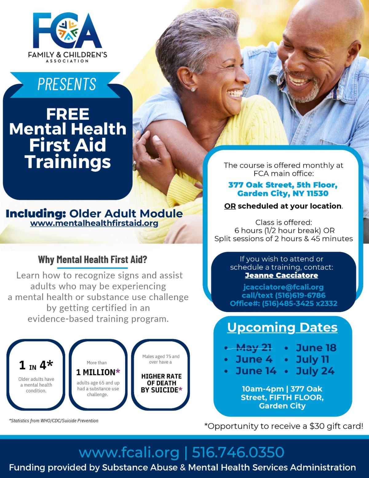 The course is offered monthly at FCA's main office at 377 Oak Street, 5th Floor, Garden City, NY 11530. The upcoming dates are July 11th, and July 24th. The class is offered as either 6 hours (1/2 hour break) OR split sessions of 2 hours and 45 minutes. Attendees have an opportunity to receive a $30 gift card. If you wish to attend or schedule a training, contact Jeanne Cacciatore at jcacciatore@fcali.org or call/text 516-619-6786.