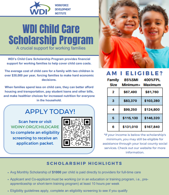 WDI's Child Care Scholarship Program provides financial support for working families to help cover child care costs. Apply today! Limited capacity by region. Questions? Contact scholarship@wdiny.org