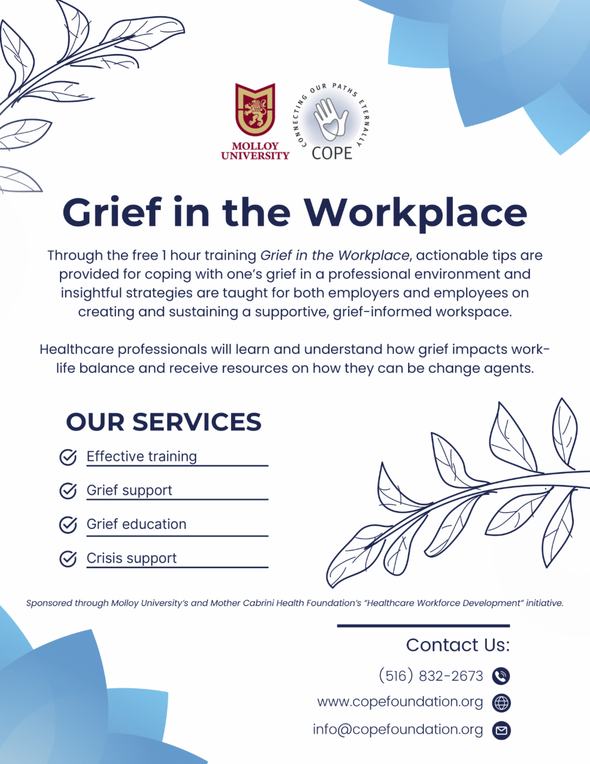 COPE is now offering a FREE Grief in the Workplace training, which provides actionable tips for coping with one’s grief in a professional environment and teaches insightful strategies for both employers and employees on creating and sustaining a supportive, grief-informed workspace.