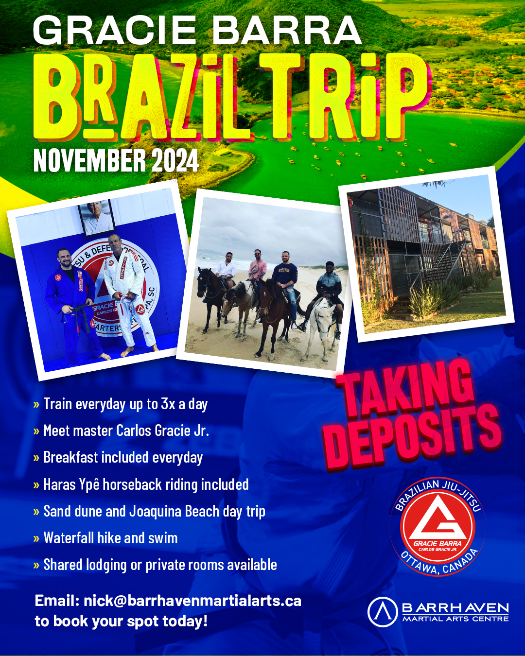 We've got some cool things planned for the trip. We'll see beautiful waterfalls where you can swim, visit Master Carlos' Jiu-Jitsu School, and ride horses on the beach. Plus, and visit other Gracie Barra schools.