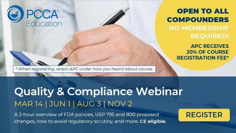 June 29: An APC webinar, Trends in Veterinary Compounding. More details coming soon.