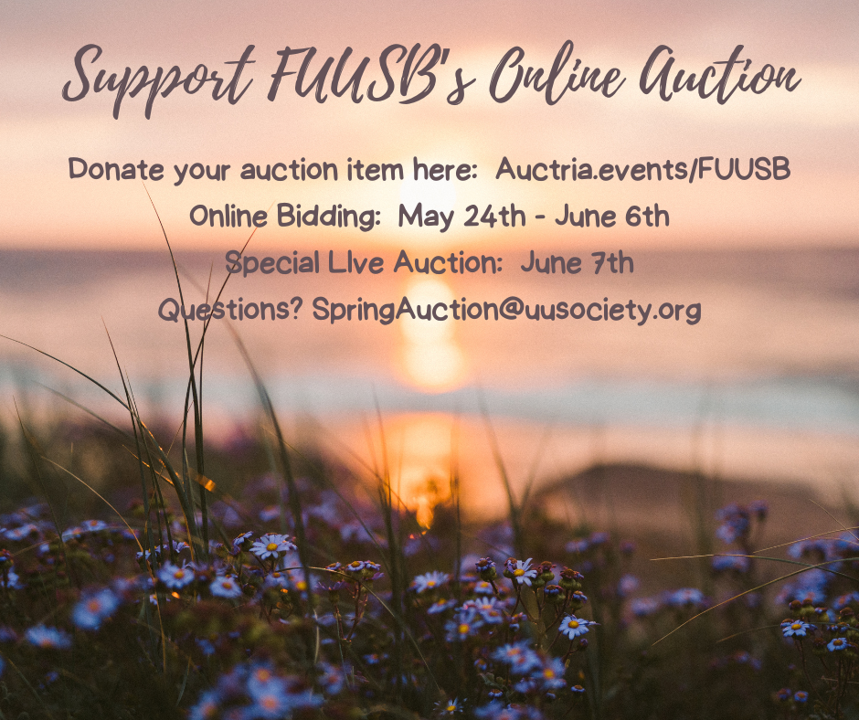 Join us for worship in person in the Sanctuary, or online. The livestream link and order of service will be shared at bit.ly/FUUSBWorship, or visit our YouTube channel.