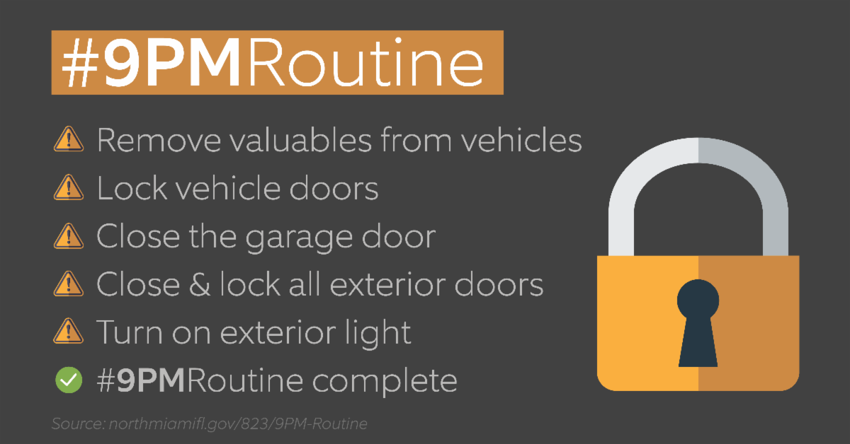 Every night before you go to bed ensure your vehicles are locked, all keys are inside the home and hidden out of plain sight. Doors are secured and locked. Garage door has been closed. Alarms are set.