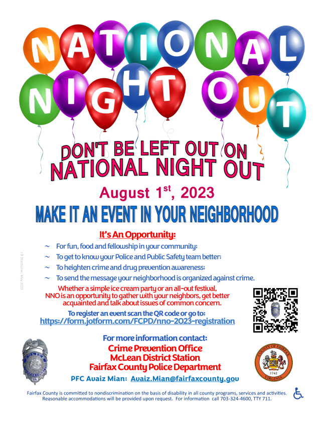 It is an opportunity to gather with your neighbors, get better acquainted, and talk about common concerns along with us, the police. Whether it is a simple ice cream social or an all-out festival National Night Out it is an opportunity for fun, food, and fellowship in your community while heightening crime prevention awareness and getting to know the officers that patrol your neighborhoods. To register your community scan the above QR code or register at NNO registration (jotform.com). For more information on National Night Out contact Avaiz.Mian@fairfaxcounty.gov
