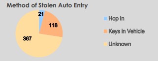 DO NOT LEAVE KEYS/FOBS IN YOUR VEHICLE! Do not give criminals an easy opportunity to steal your vehicle. Criminals will go through neighborhoods looking for unlocked vehicles in hopes of finding someone who has left the keys in their vehicles. Most newer vehicles will not let you lock your vehicle if the fob is still in the car. The below statistics are from our Auto Crime Enforcement Unit (ACE) who diligently investigate and apprehend criminals related to stolen autos.