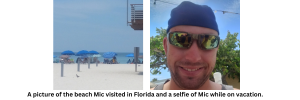 Earlier this year, during a conversation with his Individual Support Coordinator, Mic made plans to begin to cross items off his bucket list this summer. The first thing he wanted to cross off was flying on a commercial airplane. Mic made a step-by-step plan and saved money from working to plan a vacation to Florida. Mic included his mom in the planning, and they scheduled time to visit friends and other tourist destinations. While in Florida, Mic visited the beach, bought himself a souvenir, went on a dolphin tour, and ate some really good food.