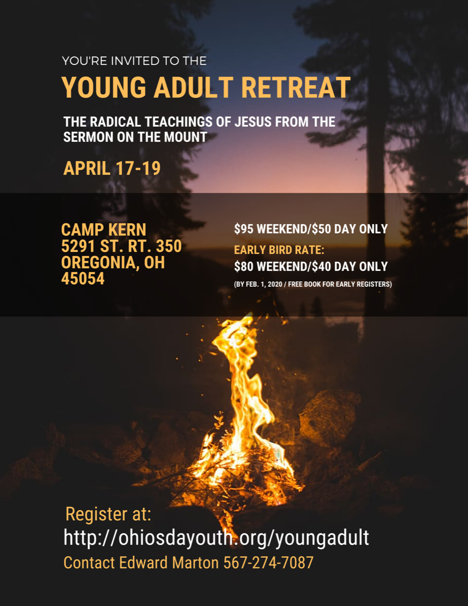 young adult retreat will be held the weekend of April 17-19 in Oregonia. The theme for the weekend will be on "The Radical Teachings of Jesus From the Sermon on the Mount." Early Bird registration ends February 1, so register soon for your free book.