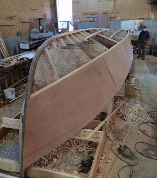 Marsh Hen design. Her owner, a recently retired architect, will finish the boat at his shop in Castine. We look forward to consulting with him and providing him assistance when necessary as he brings the boat to completion. I'm hoping this arrangement might be appealing to some other ambitious amateur builders. Doug's designs are wonderful to work from, and well within reach for many reasonably capable carpenters. But the logistics of building and rolling a hull the size of Marsh Hen or Bowler are challenging in most home shops. Have us build the hull and call or e-mail whenever you need help. It could be a cost effective and rewarding way to take on a project that might otherwise be out of reach.