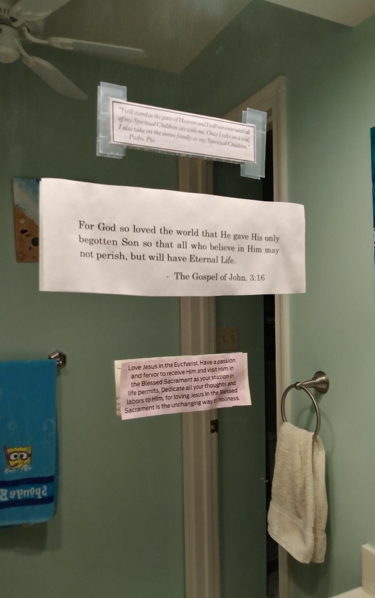 We have all the resources in our home that most Catholic families do: Bibles, spiritual books, prayer cards, rosaries, palms, scapulars, statues, pictures, and special gifts given on sacramental occasions. You name it; we have it. We even have a family prayer space in our upstairs hallway. Yet, the most effective home-based teaching tool in recent years at my house has indeed been my boys’ bathroom mirror. This bathroom mirror catechism has deepened my sons’ relationship with God in a remarkably unexpected way. At the same time, it’s deepening our parent-child relationship and nurturing their Christian moral formation in a mostly unspoken way. Who knew?
