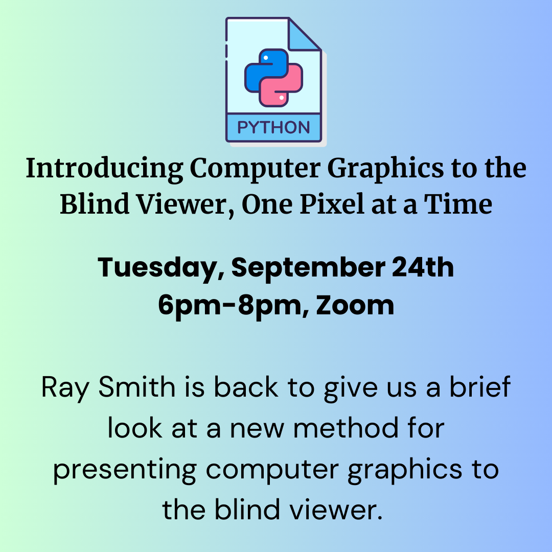 Instructor and Python guru Charles (Ray) Smith will describe and demonstrate methods available to aid the completely visually impaired in discovering the world of simple computer graphics.