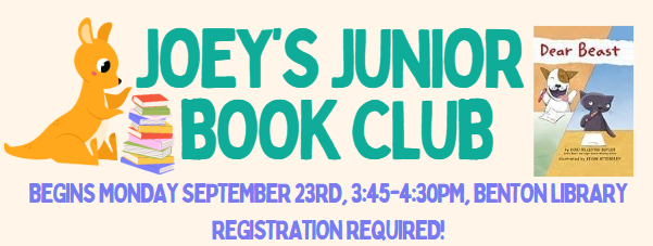 Sign up and join our monthly book club just for new readers and their grownups! Read the book at home, and then gather at the library to discuss the story and do fun activities. Our September book is Dear Beast by Dory Hillestad Butler. Pick up a copy at the Children’s Space at the Benton Library at 75 Oakley Road.