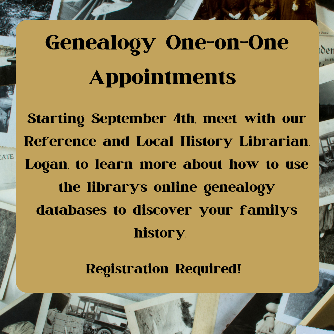 Interested in learning about your Genealogy or family history? Starting on Wednesday, September 4th, meet with our Reference and Local History Librarian, Logan, to learn more about how to use the library’s online genealogy databases to discover your family’s history.