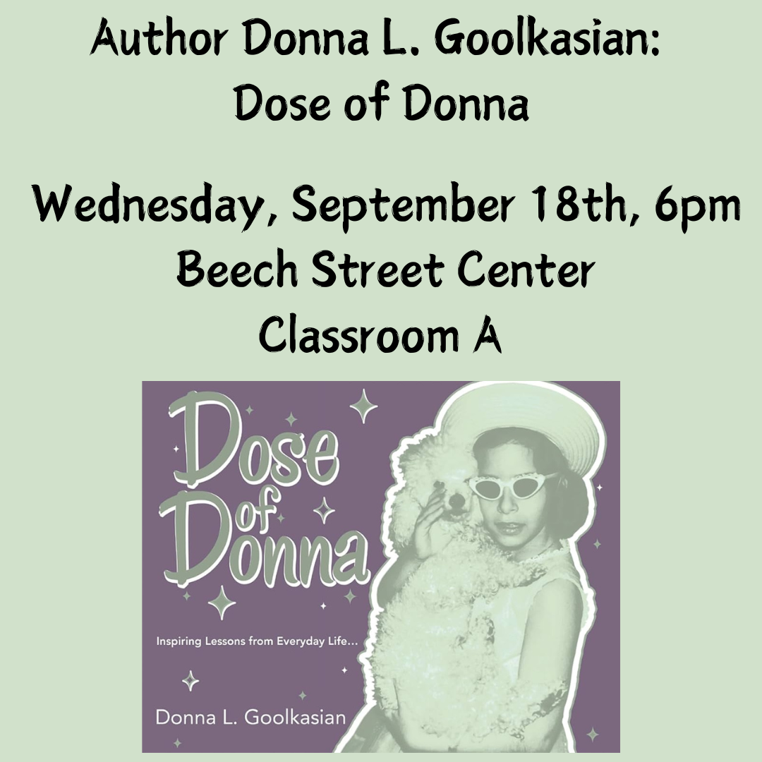 Donna Goolkasian will be here to discuss her book; Dose of Donna: Inspiring Lessons from Everyday Life.