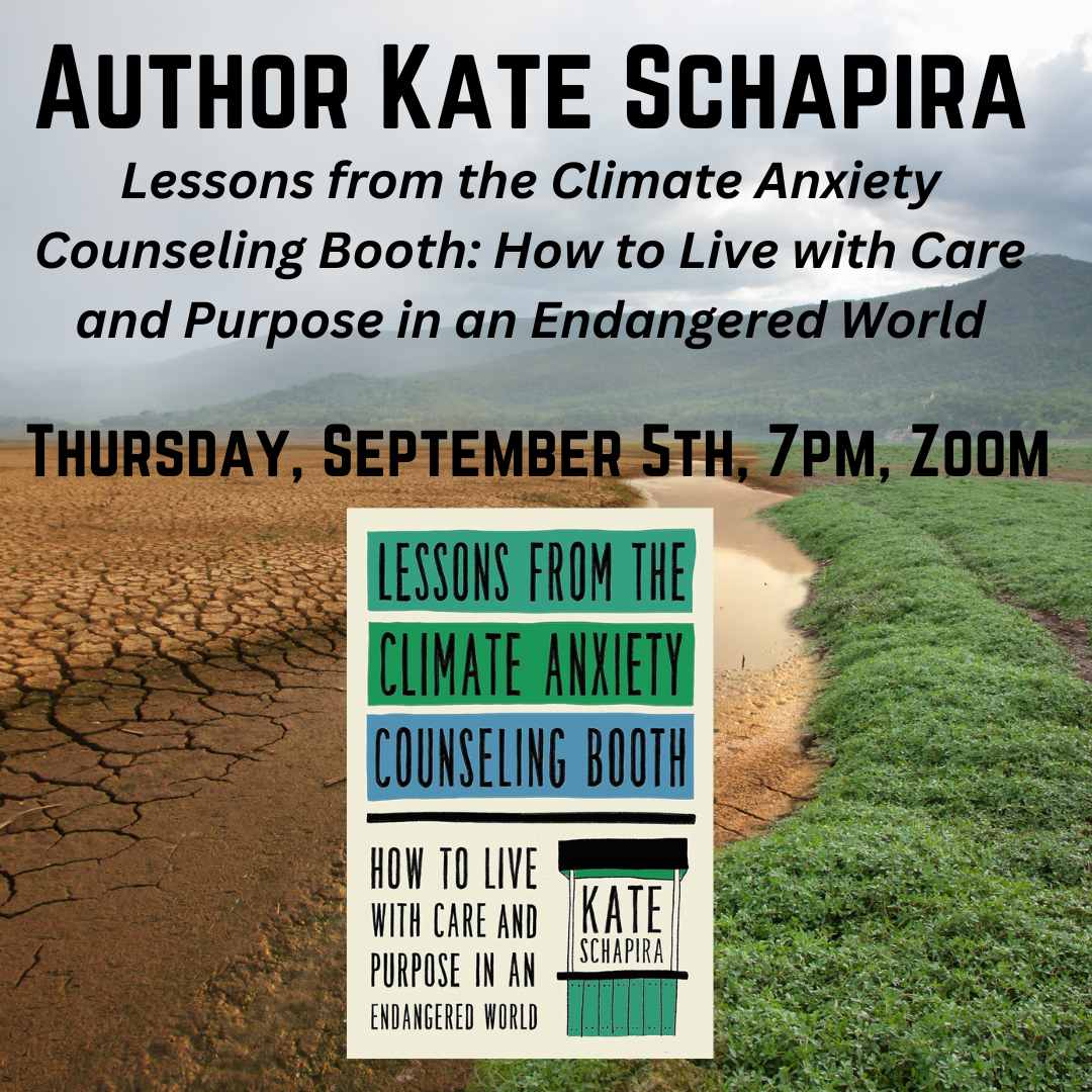 Kate Schapira, author of Lessons from the Climate Anxiety Counseling Booth: How to Live with Care and Purpose in an Endangered World, will share methods for living with our emotional responses to climate realities and using them as guides to connection and action.