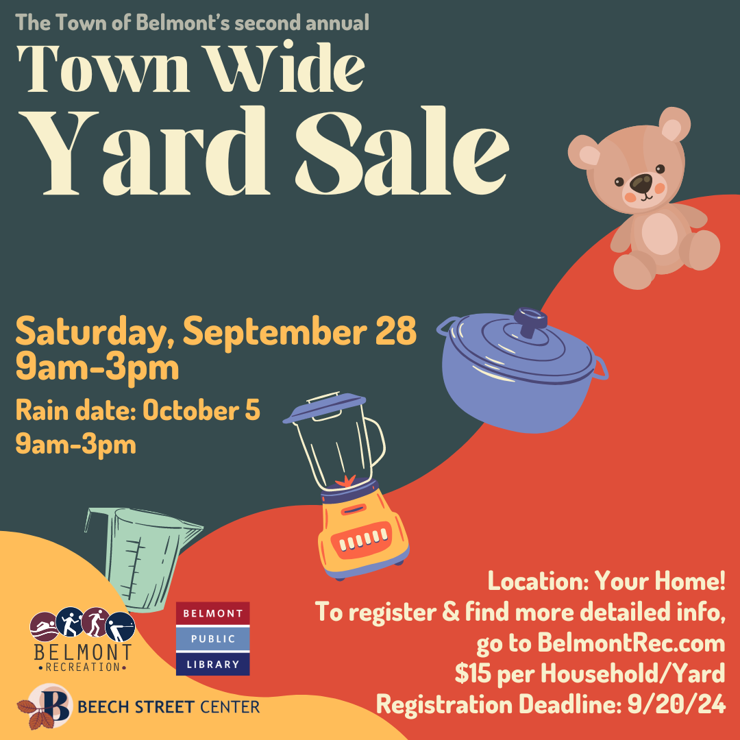 Join us for the Belmont Town-Wide Yard Sale! Mark your calendars for Saturday, September 28th, from 9am to 3pm, as the Belmont Library, Council on Aging and Recreation Department hosts the much-anticipated Town-Wide Yard Sale! This annual event is the perfect opportunity to declutter your home, find unique treasures, and connect with neighbors. Last year, over 125 homes participated. You’re sure to discover fantastic deals and hidden gems. Whether you’re looking to sell or shop, this community event is not to be missed! If you’d like to host a yard sale, please sign up here.