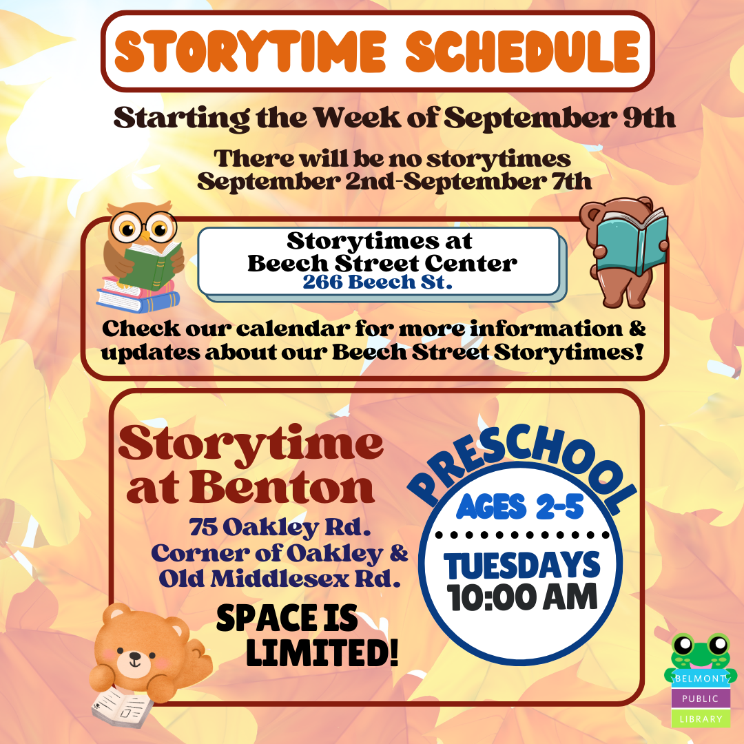 Starting the week of September 9th! (There will be no storytime Sept. 2nd - Sept. 7th)