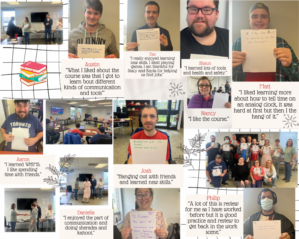 We are pleased to announce the successful completion of a comprehensive skills development program by our participants. Throughout the program, participants have honed a diverse set of skills including resume building, interview techniques, precise measurements using various tools like tape measures and rulers, analog clock time-telling, effective communication encompassing tone and cadence, both verbal and non-verbal cues, tool expertise, WHMIS and Health and Safety knowledge acquired through a 4-step course, as well as the ability to fill out evaluation forms and provide constructive feedback. This achievement showcases their dedication to personal and professional growth, equipping them with essential skills for future endeavours.