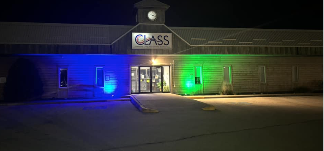 CLASS is lit up blue and green to celebrate #CLMonth2024 this is in support of being a member of Community Living Ontario.