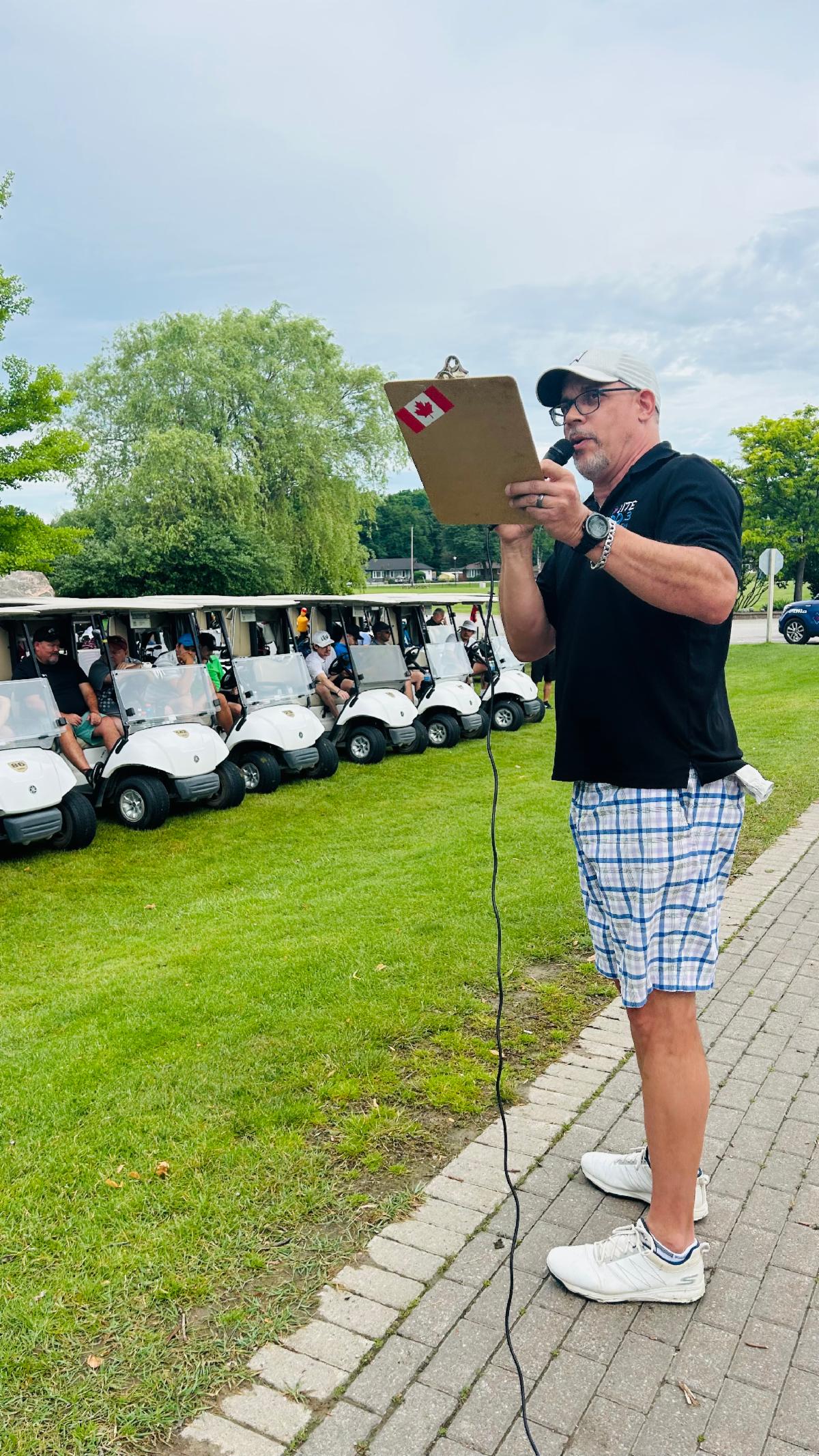 | Photo above - donation from The Nottawasaga Foundation in support of the 29th Annual Golf Tournament on June 19th. From left, Andrew Walker, Peter Biffis, and Jamie Sheppard. | Photo above - JD Moffit, from Lite 99.3 MC for the tournament welcomes the golfers and thanks the sponsors before the 9am shotgun start. | Storytelling - Fostering Personal Journeys | "It started with a dream of mine," Matt shared. | |