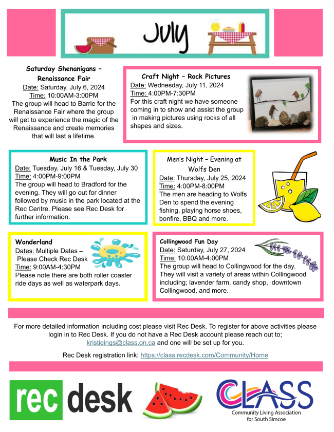 CLASSetball is held every Wednesday from 1-2pm at head office through the summer. There will be lots of shade and seating provided, lemonade, and a small snack. Even if your not interested in playing basketball, come join for the social part! Thank you to staff Dawn West for running this program.
