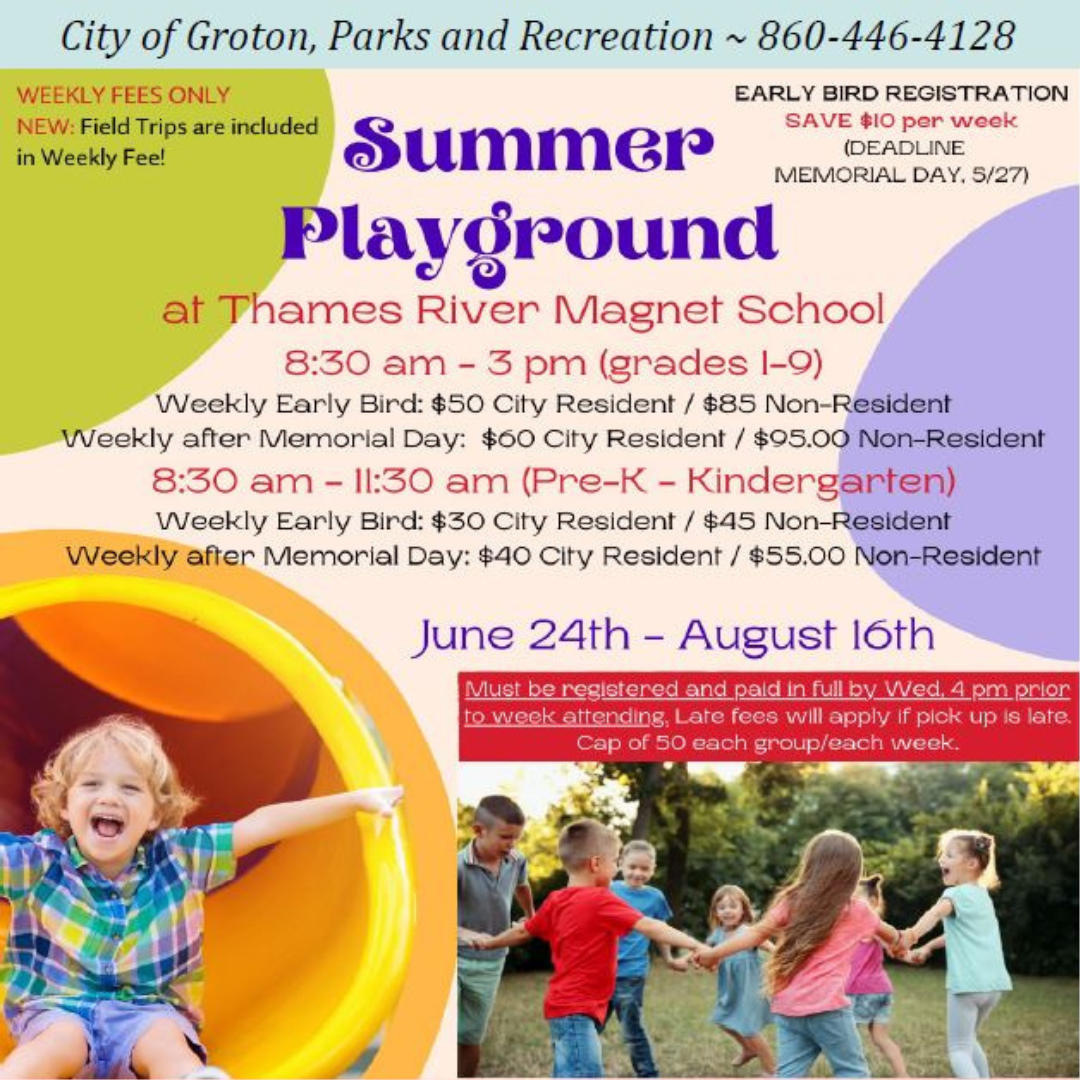 Summer Playground camp is available for kids entering Pre-K through Grade 9 and runs from June 24th - August 16th. Children can enjoy eight weeks of summer activities, field trips, beach days and fun with friends!