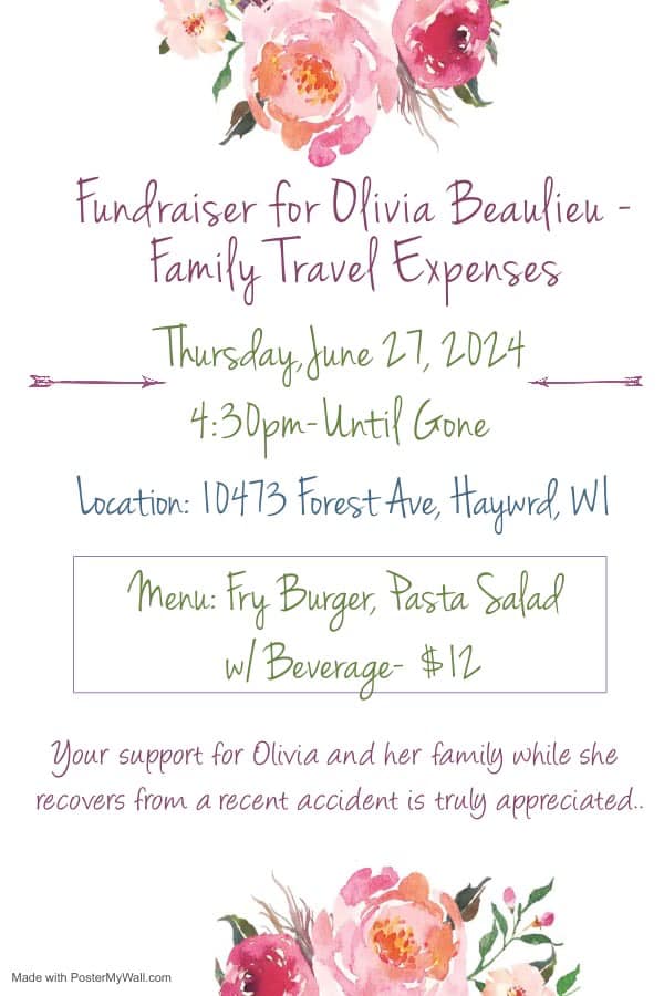 One of the teenage girls critically injured in this accident has been identified by family members as Olivia Beaulieu of LCO. There are two fundraisers being held in the community to help her family with expenses and their extended stay in Duluth while she goes through her surgeries. Information on one of the fundraisers is in the flyer above and here is information on the other: Fundraiser on Friday, June 28: Tina Miller and Amanda Scheel are having a food sale this Friday at the LCO Ojibwe University from 11am-sold out. They will be serving hamburger gravy over mashed potatoes, with green beans, frybread, dessert, and a beverage. $15 per plate. 100% of the proceeds will be going to the families of the two girls seriously injured in a car accident on June 21st. A donation jar will also be there if you aren’t hungry and just want to donate.