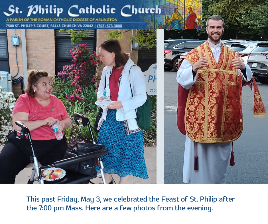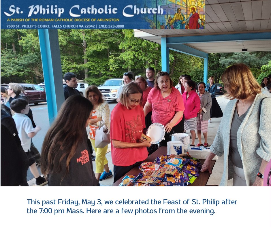 Last Friday was the Feast Day of our patron, St. Philip and had a little celebration after the 7 pm Mass. Here are some photos of the event. More photos are posted on: https://www.facebook.com/StPhilipCatholicChurch