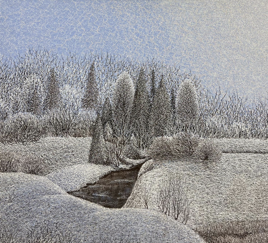 "The Russian aggression of Ukraine brought me to Nebraska. War has cancelled my exhibitions and my paintings in museums have been lost. Meanwhile, my parents remain in Ukraine, my siblings are dispersed, my children have become bilingual, and America is my home. As an immigrant facing hardship, I've sought the Midwestern landscape as inspiration for my paintings. Trees symbolize stability and protection. My tender roots are now feeling their way through a new homeland. I search for continuity of my Ukrainian past and American present with hopes for the future."