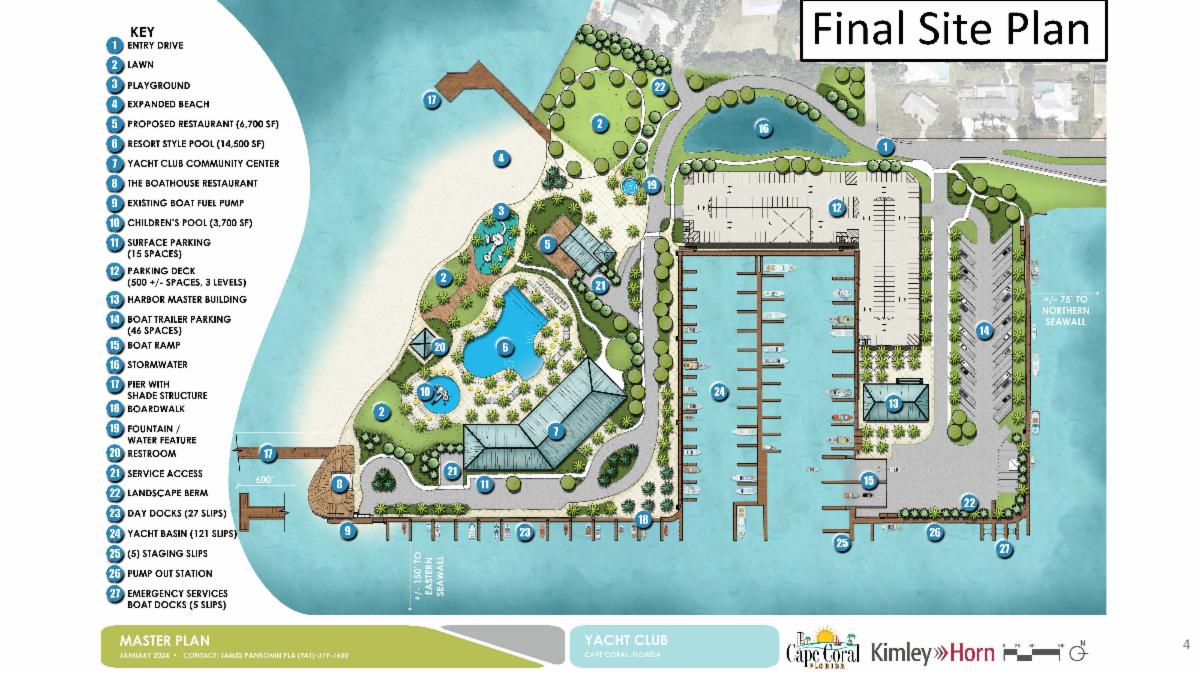 The Yacht Club project design firm, Kimley Horn, presented a Final Site Plan for the Yacht Club Community Park at the January 17 Committee of the Whole Meeting. The revised plan was developed using feedback the City Council provided in November.