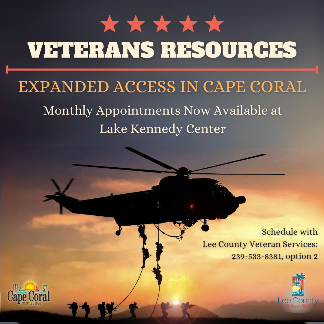 Individualized appointments with Lee County Veteran Services staff are now being offered monthly at Lake Kennedy Center (400 Santa Barbara Blvd). For more information or to schedule an appointment, call 239-533-8381, option 2.