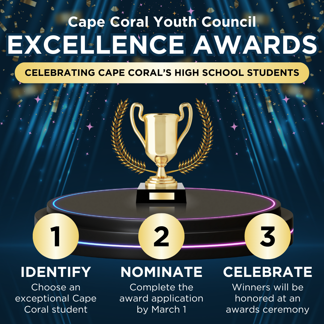 The Cape Coral Youth Council announces its "Excellence Awards" program, honoring Cape Coral students who excel in five categories: Leadership, Arts, Civic Engagement, Academics, and Athletics.