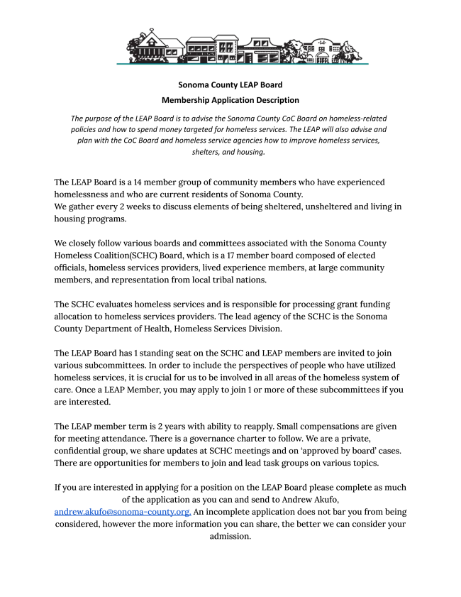 The Lived Experience Advisory and Planning (LEAP) Board is composed of diverse people with lived experience of homelessness, with an emphasis on racial and ethnic diversity in its composition. The purpose of the LEAP Board is to advise and plan with the Sonoma County Homeless Coalition Board and homeless service agencies how to improve homeless programs, services, shelters, and housing.